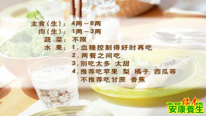向红丁教授认为:糖尿病人在控制量的前提下什么都能吃,基本的饮食原则为:主食粗细搭配,每天4-8两;肉类包括蘑菇每天1-3两;蔬菜不限;零食如花生、瓜子等每多吃一把就减1两粮食;水果是血糖控制得好时再吃,两餐之间吃,不要吃太甜太多,推荐苹果、梨、橘子、桃、西瓜,不推荐甘蔗和香蕉。详情请看本期节目。糖尿病人的运动应该是有氧运动与阻抗运动相结合。有氧运动时心率不超过170减去年龄数,阻抗运动的目的是锻炼肌肉,刺激胰岛素的分泌,降低体重、血压等。更多内容请收看本期节目。 |