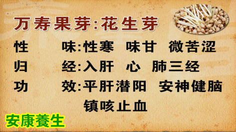 其实,只要正确处理,花生芽还有非常神奇的养生功效,被称为万寿果芽。花生芽外形酷似豆芽,洁白如玉,比花生营养更好、口味更佳。具有营养、抗癌、延缓衰老等作用。中医认为,花生芽甘寒、微苦涩。入肝、心、肺三经,具有清肝、安神、化痰等功效。
