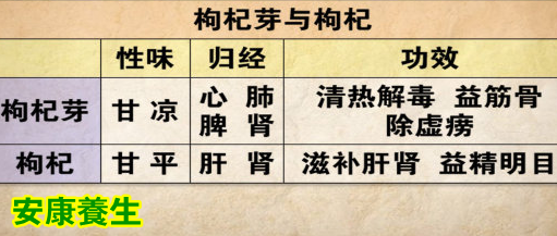 枸杞芽与枸杞都归肾经,但枸杞还归肝经,以下焦为主,补肝肾阴精为主。而枸杞芽归心、肺、脾经,以中上焦为主,主要是清热解毒,益筋骨。