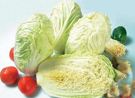 原料:白菜心2000克、冻豆腐一块、红青柿子椒各100克、熬浓的黄瓜汁、盐、鸡精适量。