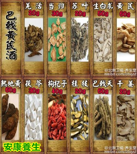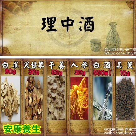 泡制药酒讲究不少,白酒释放药效最佳,但如果您不胜酒力,则可以选择黄酒,红酒。泡酒容器一定避免金属材质,防止有害物质析出,最好选择砂锅、瓷瓮、玻璃器皿。在泡酒前,根据药材大小,都要切成薄片,或捣碎成粗颗粒状,药和酒的比例为1:10,泡制一个月即可饮用,每天喝不超过二两。 药酒中的药材一般只用一次,喝完最好更换新药,以免药效减弱,如果泡两次,则可以改变药和酒的比例,从1:10变成1:4。另外药酒也是药,一定根据自身体质,医生药方来泡制,比如补肾阳虚的药酒,就不适合患有三高、肝功能不好的患者。 人体各个脏腑都有阳气,除了肾阳,脾阳也至关重要,脾为气血生化之源,可把脾胃产生的营养物质输送全身,脾阳虚不仅会造成消化异常,还会造成阳气产生的减少。如果您有食欲减退、腹胀、胃痛而喜温喜按、四肢不温、大便稀溏,畏寒喜暖这些症状,则说明脾阳虚了。 理中酒,原配方是汉代《伤寒论》中的方子,有人参、白术、炙甘草、干姜,用于治疗寒邪引起的胃疼,腹痛,脾胃阴冷。而新加入的10g吴萸,则可以温肝温胃散寒邪,组成适合冬季御风寒补脾阳的理中酒。 中医讲久病多虚,久病及肾,所以脾虚的人时间长了就会影响到肾,肾阳虚久了也会影响到脾,脾肾是母子关系,互相影响。严重的脾阳虚在补脾阳的同时必须要补肾阳,也叫补母生子,补火生土。尤其老年人易出现脾肾两虚的情况,需要同时补益。 冬季御风寒,专家推荐的药酒方是巴戟黄芪酒,在温肾壮阳的同时,益气健脾。其中巴戟天、枸杞子、熟地黄补肾温阳,干姜温胃散寒,黄芪、白术益气健脾,当归养血,苏叶和羌活则可温通经络,疏散风寒,补肾阳,正适合冬季防止寒邪侵袭,补充人体阳气。 |